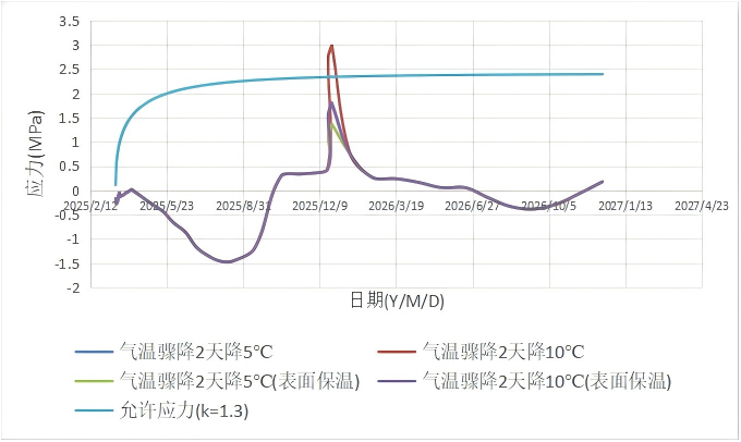 圖:天臺上水庫大壩面板氣溫驟降應力對比圖