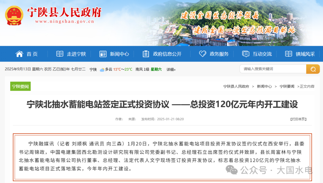 2025年1月20日,寧陜縣人民政府與西北院已簽訂項(xiàng)目投資開發(fā)協(xié)議,寧陜北抽水蓄能電站有限責(zé)任公司已經(jīng)成立。