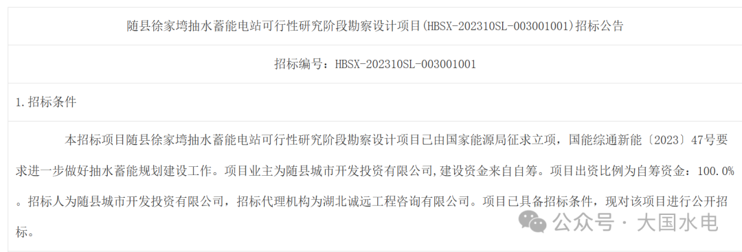 前期階段(2022-2023年)由隨縣城市開發投資有限公司作為項目前期業主,負責項目立項、勘察設計及可行性研究招標工作。中國電建集團中南勘測設計研究院有限公司以報價 158796700 元成功中標可行性研究階段勘察設計項目。