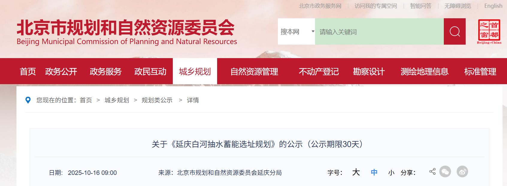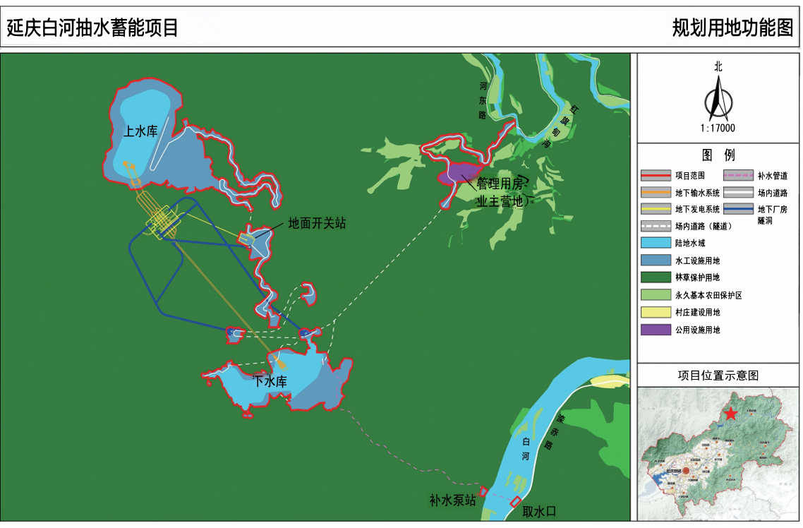 2025年10月16日,北京市規劃和自然資源委員會延慶分局對延慶白河抽水蓄能電站項目的選址規劃進行了公示。根據公示信息,項目位于延慶區千家店鎮六道河村西部,上水庫建于黃木溝,下水庫利用賓榔溝的地形建設。該電站規劃裝機容量為100萬千瓦(1000MW),是一座大型抽水蓄能電站,總用地面積約140.29公頃(具體指標以最終審批方案為準)。